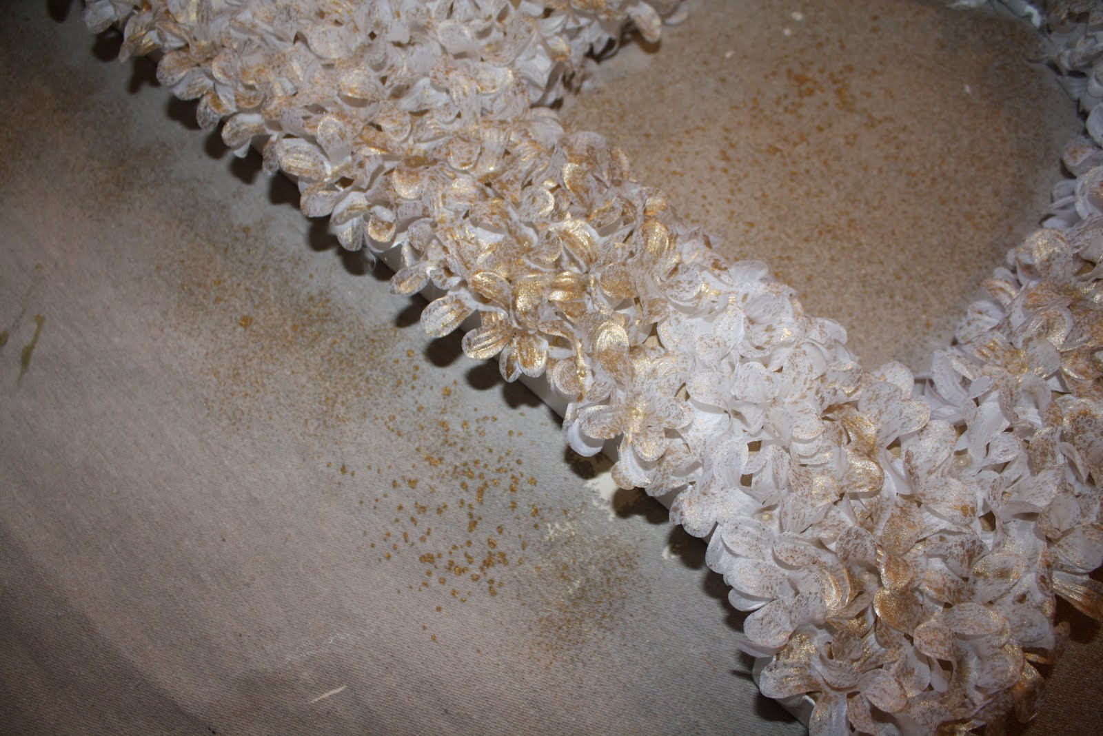 But here's where I run into a problem. All along I have been bothered by the petals being stark white. Our wedding colors are ivory and gold, and I've wanted to do something to make the letters look more ivory. Or gold. So this weekend when we were buying the supplies for our sparkly wands, I grabbed some gold fabric spray paint. And then I sprayed.